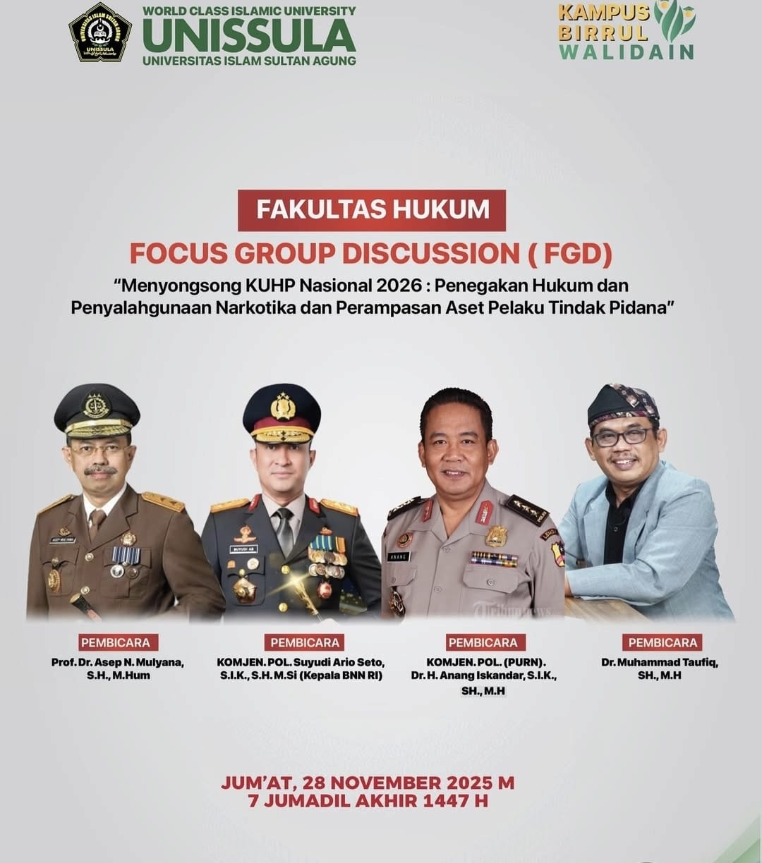 Fakultas Hukum Unissula akan menyelenggarakan FGD tentang menyongsong KUHP Nasional 2026. Penegakan Hukum dan Penyalahgunaan Narkotika dan Perampasan Aset Pelaku Tindak Pidana 2023. Diskusi akan digelar Jumat, 28 November 2025 di Ruang Seminar lt. 3 FH Unissula.