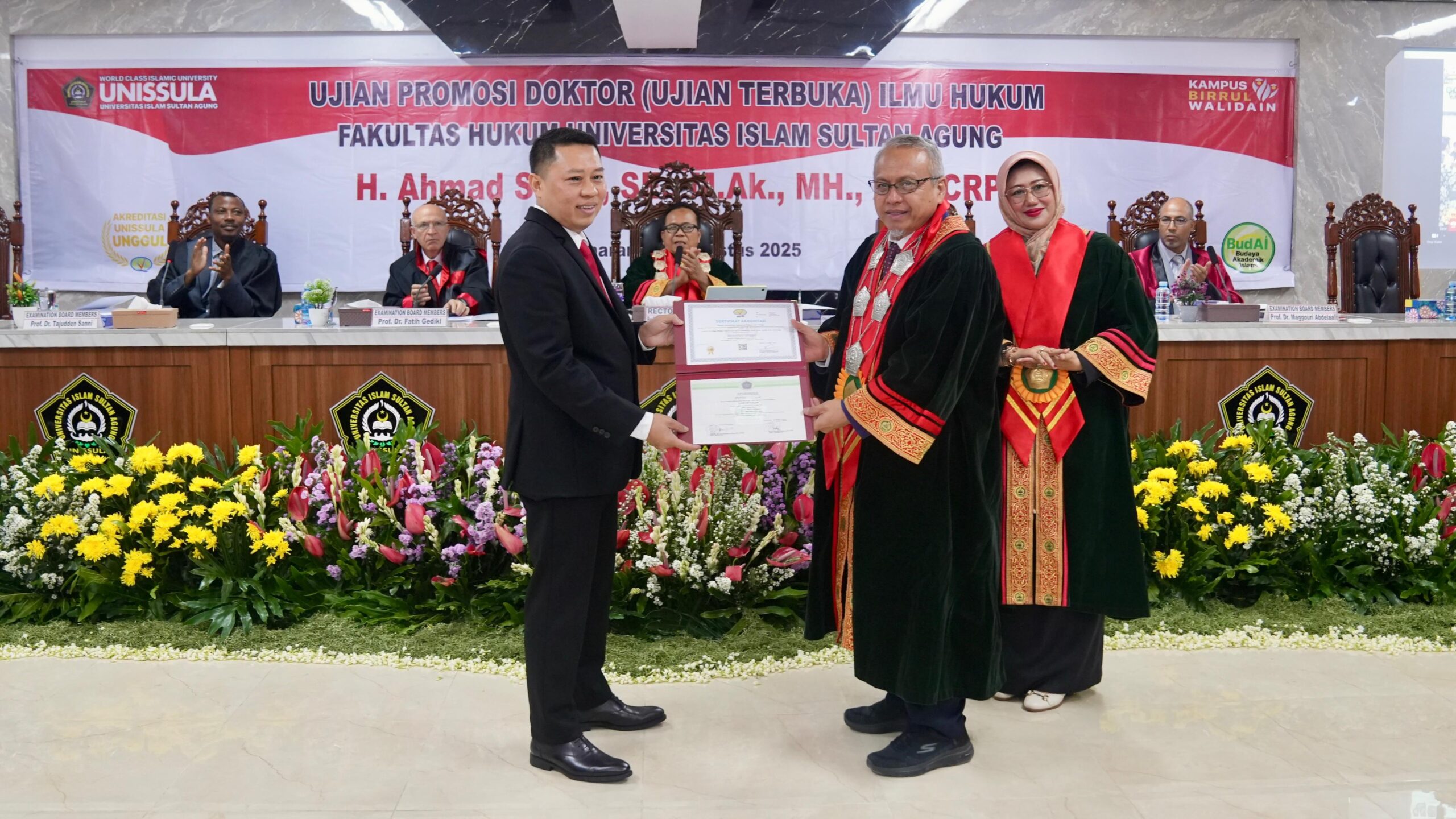Penguji diantaranya dari Unissula Prof Dr Gunarto SH MH, Prof Dr Anis Masdurohatun SH MHum, Prof Dr Jawade Hafidz SH MH, dan Dr Widayati SH MH. Prof Dr Mahmutarom SH MH dari Unwahas Semarang. Prof Dr Tajudden Sanni dari Maldives University, Prof Dr Fatih Gediki Istanbul Turki, dan Prof Dr Maggouri Abdelaali dari Maroco.