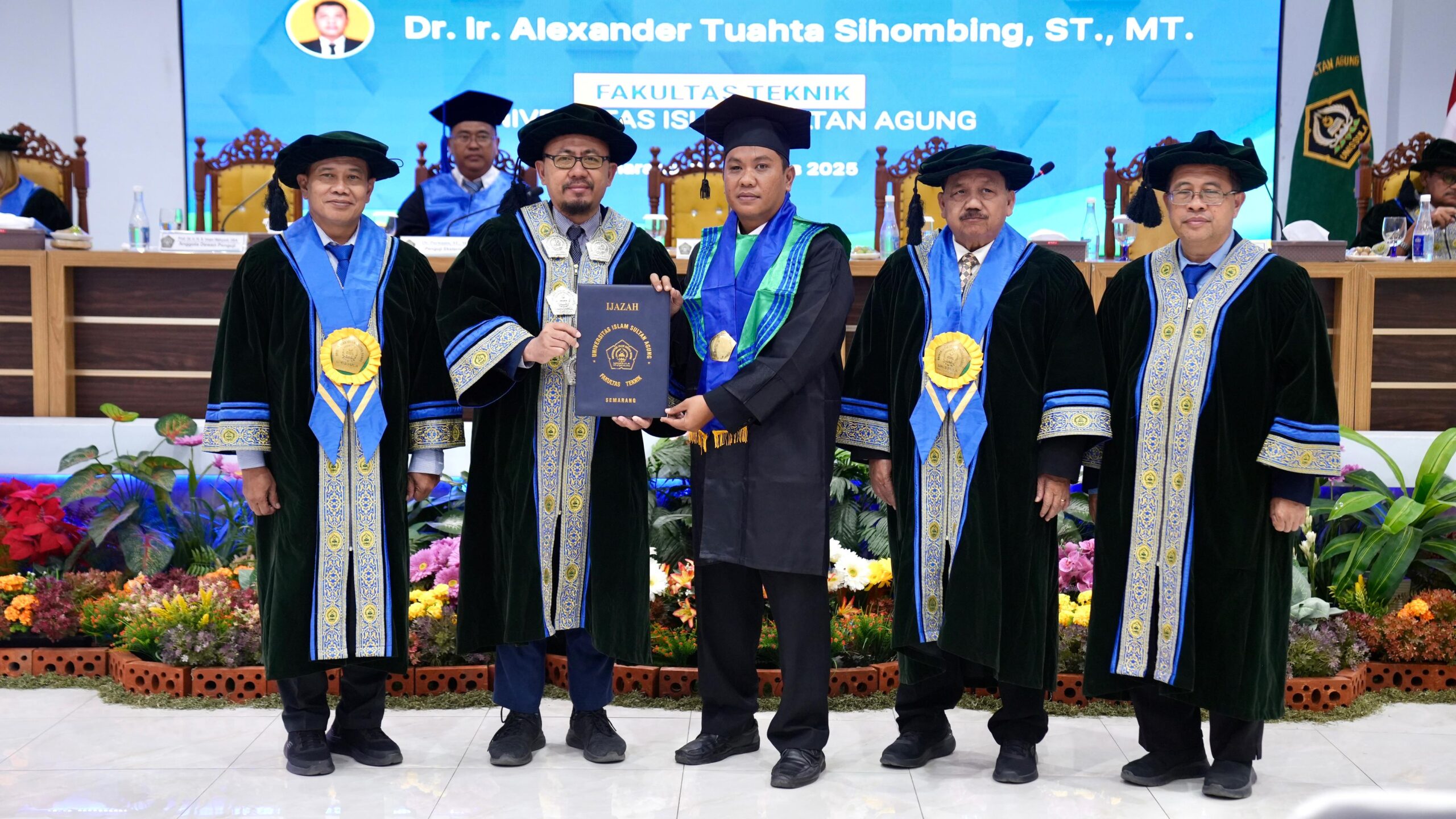 Ir Alexander Tuahta Sihombing ST MT mengikuti sidang terbuka promosi doktor di Program Doktor Teknik Sipil pada Kamis (28/8/2025) di Fakultas Teknik Sipil Unissula. Ia mempresentasikan disertasinya berjudul model pengaruh kerusakan jalan terhadap kinerja lalu lintas dan perilaku pengemudi perkotaan.