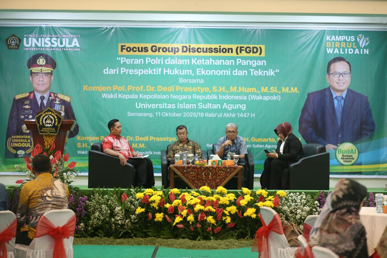 Unissula menggelar Focus Group Discussion (FGD) bertajuk peran Polri dalam ketahanan pangan dari perspektif hukum, Ekonomi, dan teknik di Gedung Kuliah Bersama lantai 10, Sabtu (11/10/2025). Kegiatan ini menghadirkan tiga narasumber lintas disiplin ilmu, yakni Prof Dr Anis Masdurohatun SH MHum (Ketua Program S3 Ilmu Hukum), Prof Dr Widodo SE MSi (Ketua Program S3 Ilmu Manajemen), dan Prof Dr Ir Slamet Imam Wahyudi DEA (Ketua Program S3 Teknik Sipil). Adapun moderator Dr Mochamad Abdul Basyir SPd MPd.