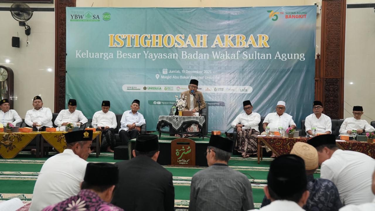 Yayasan Badan Wakaf Sultan Agung (YBWSA) menyelenggarakan istighotsah akbar dan santunan anak yatim. Santunan diberikan kepada 50 siswa dan siswi binaan YBWSA melalui Lazis Sultan Agung di Masjid Abu Bakar Assegaf kampus Unissula, Jumat (19/12/2025).